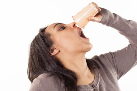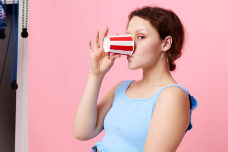 pretty girl drinking from a disposable glass close-up pink background unaltered