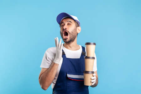 Tired sleepy courier man in blue overalls holding three coffee and yawning with exhausted bored expression, bringing drinks in disposable cups. Lack of energy, need caffeine to work
