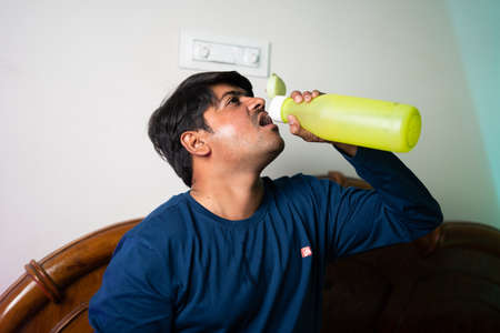 Thirsty young man drinking water on bottle after wake up at bedroom - healthy lifestyles, relaxation and wellness.