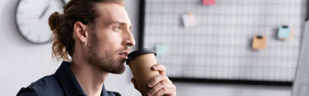 Confident young adult man holding paper cup and looking away with blurred mesh organizer on background, banner