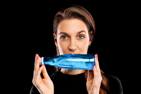 A picture of a young woman posing with a bottle of water over black background