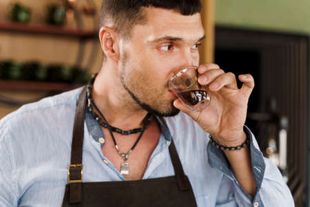 Male barista drinking organic coffee from glass