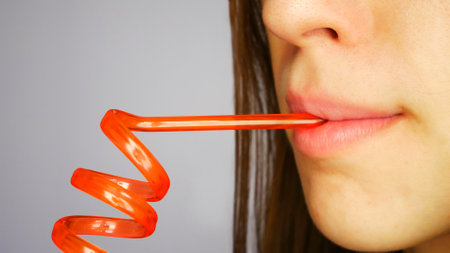 Close-up of the lips of a beautiful girl drinking from a twisted straw