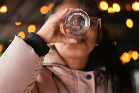 girl in glasses drinks water from glass bottle, close-up portrait of white caucasian woman, stock photo image