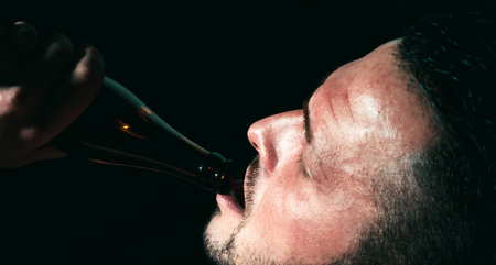 Upset man drinker alcoholic with glass drinking whiskey alone, sad depressed addicted. Man with bottle of beer, close up face.