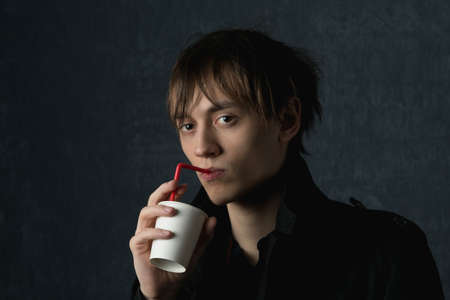 A young guy with brown eyes poses in front of the camera on a dark background, and drinks a drink from a disposable cup through a straw