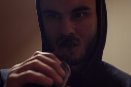 Drunk and depressed lonely man holding a glass of vodka