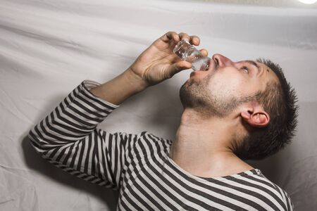 Drunk and unshaven male alcoholic finishes his vodka from the shot glass.