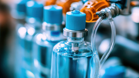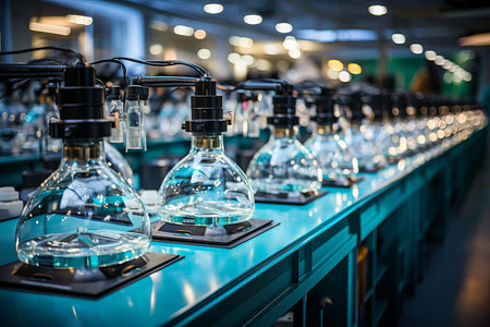 Modern chemistry lab with glass containers, clear liquid, and scientific equipment for experiments and analysis. Blue tables and connected tubes in the laboratory.