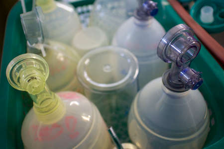 Bottles with plastic hose for mobile phase with different organic solvents for high performance liquid chromatography. Analytical or clinical laboratory