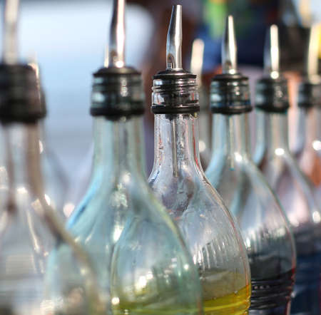 Colorful glass bottles on the shelf in the store. Blurred background