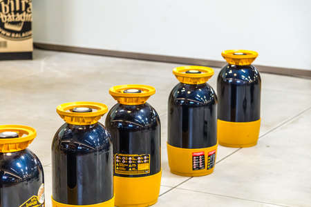 Brightly colored gas cylinders with shiny metallic fittings stand upright in a spacious industrial warehouse, creating a vibrant, organized storage sc