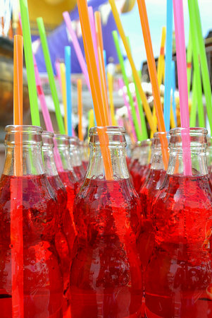 close up the red cool colorful drink with yellow tube.