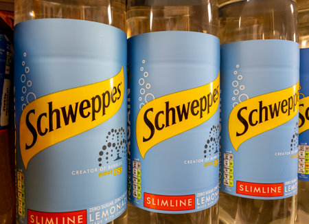 London. UK- 02.08.2023. Large bottles of Schweppes soft drink on a grocery supermarket shelf.