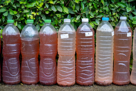 Plastic transparent bottles with liquid of different colors. Сontainers and packaging made of plastic and polyethylene. Recycling and reuse of plastic waste