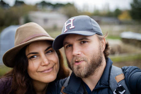 HAKONE, JAPAN - NOVEMBER 5, 2017: Young couple doing selfie on a background of mountains. Copy space for text