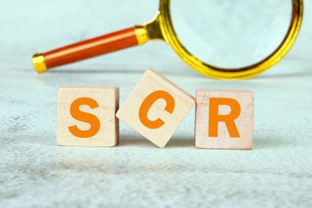 SCR word word is assembled from wooden cubes with a magnifying glass in the background