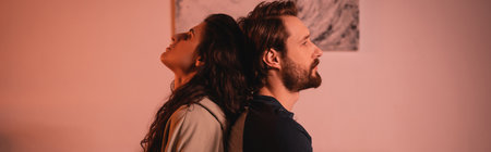 Side view of displeased couple with relationship crisis sitting back to back at home in evening, banner