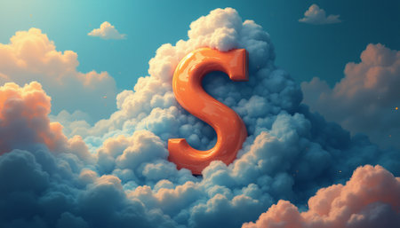 A bold, glossy orange letter S stands out against a dreamy backdrop of soft, billowy clouds illuminated by warm sunlight. This whimsical scene evokes a sense of wonder and creativity, inviting viewers to explore their imagination.
