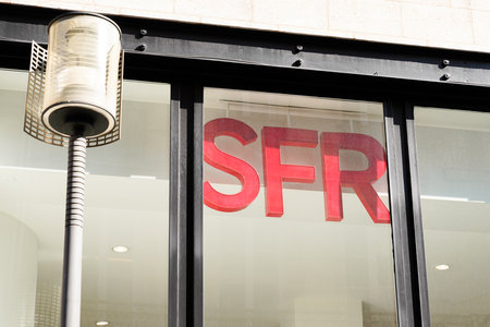 Mulhouse - France - 21 February 2021 - Closeup of SFR logo on phone store front, SFR is the famous french phone operator