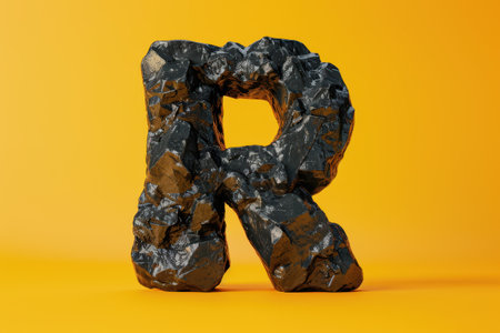 The letter R is made of rocks and is on a yellow background. It looks like a sculpture rather than a letter