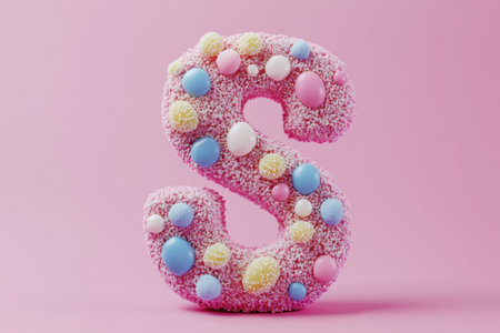 A pink and blue frosted cake with sprinkles on it that says S. The cake is decorated with colorful sprinkles and has a fun, playful look to it