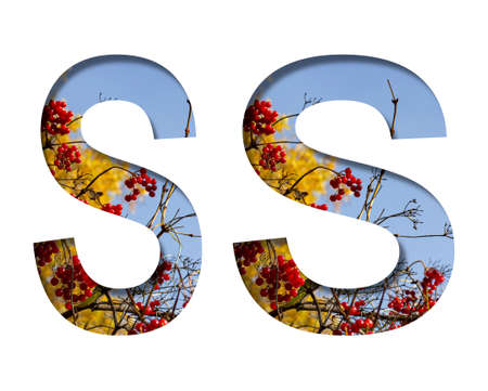 Letter S cut out of white on a background of autumn ripe red viburnum berries, autumn trees and a beautiful blue sky. Decorative autumn font.