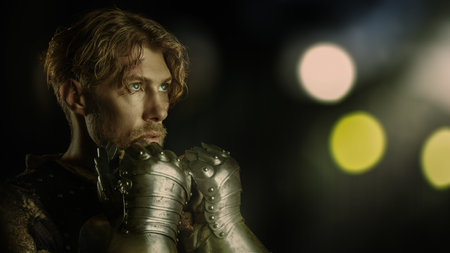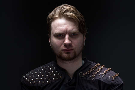 Portrait of handsome medieval knight in suit of armour with beard looking seriously at camera