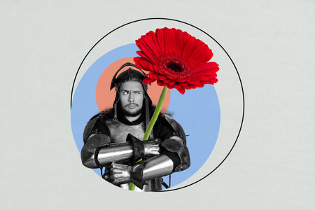 3D photo collage artwork composite of spring season plant young man warrior history clothing character knight armor hold gerbera flower