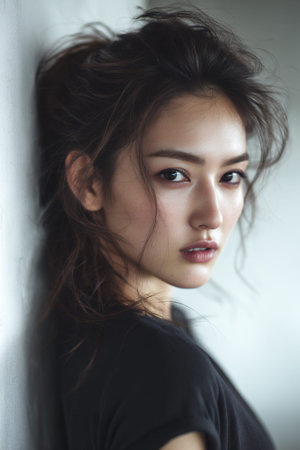 A young woman with dark, messy hair and striking eyes looks over her shoulder towards the camera. She is wearing a black top and leaning against a white wall. The lighting is soft, highlighting her features and creating a moody atmosphere.