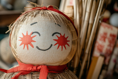 A vibrant traditional straw doll adorned with a cheerful face and red ribbons symbolizes joy. It ready stands for the lively Mardi Gras and Maslenitsa celebrations, highlighting cultural heritage