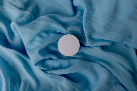 Flat lay blue natural background with white cosmetic bottle jar. Creative cosmetic layout, minimal concept, copy space.