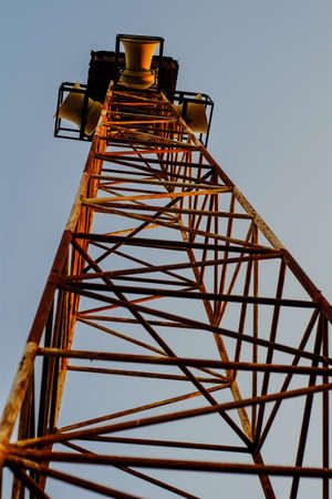 Surrounded megaphone at the top of tower with blue sky background