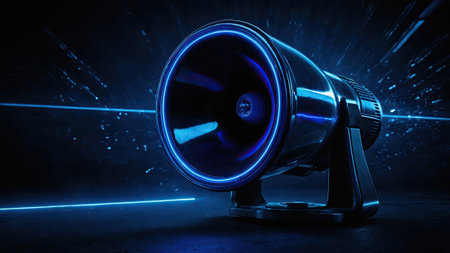 A high-powered speaker sits on a stand, illuminated by striking blue lights in a dim environment, enhancing the overall energetic vibe suitable for concerts or events.