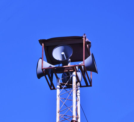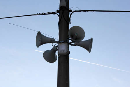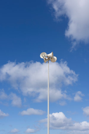 Outdoor loudspeakers with bright blue sky background