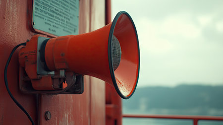 Megaphone mounted on a ship's railing, ready for emergency alarms. Captures the essential equipment used to alert crew and passengers during critical situations. -