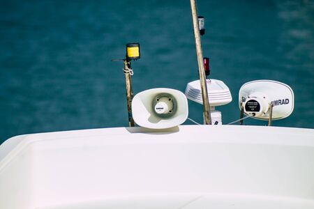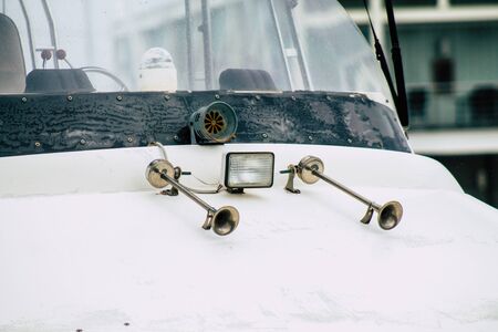 Detailed close up of white speaker on sail boat. Marina details concept.