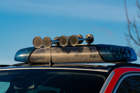A police vehicle equipped with a light bar featuring multiple siren horns sits under a clear blue sky. The vehicle is parked, showcasing its emergency equipment in a well-lit environment.