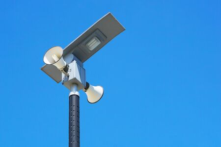 Outdoor loudspeaker on pole against the background of blue sky, sound waves.