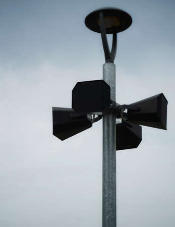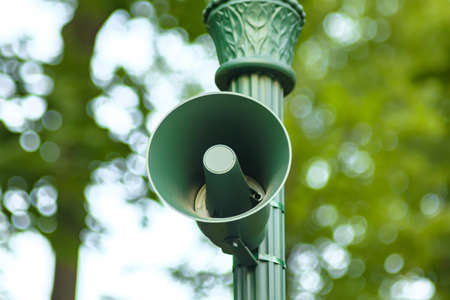 Loud outdoor speaker. Public park audio sound system. Loudspeaker for siren, alarm or announcement. Vintage green voice speak megaphone on pillar for information broadcast, allert