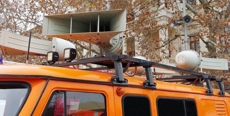 car with loudspeaker on the roof and LED lights. Closeup.