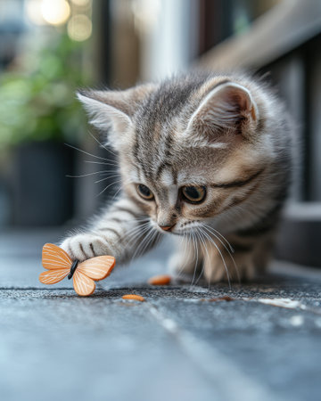A kitten is playing with a butterfly on the ground. The kitten is gray and white, with its paw outstretched to touch the butterfly. The butterfly is orange and yellow, with its wings spread out. The background is blurred, but it appears to be a room with a window and a plant.