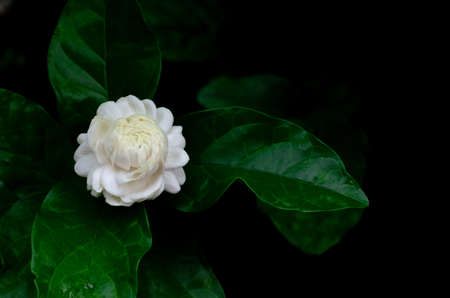 The single beautiful fresh white Thailand Jasmin flower with its leaves from garden which use for aroma and tea isolated on black background.