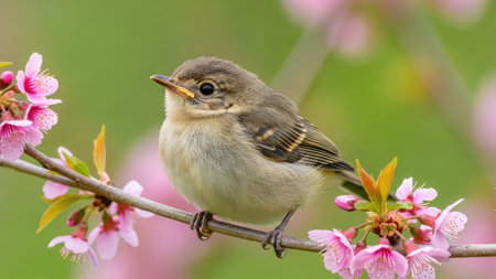 A chiffchaff (Phylloscopus collybita) perched on a pink blossom.