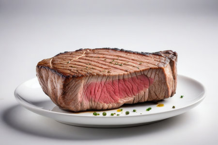 Grilled beef steak with spices on a white plate on a white background