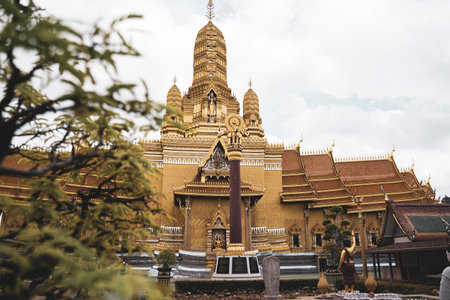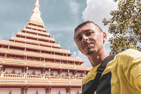 Handsome male tourist man at the Phra Mahathat Kaen Nakhon pagoda style buddhist temple and Wat Nong Waeng golden temples in Khon Kaen Province Isan Northeast Thailand.
