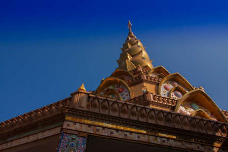 Gold color roof of buddhist temple with blue sky background. isosceles triangle shape.