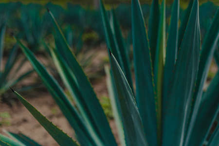 A closeup shot of a beautiful Agaves Tequila plants in Mexico in an agricultural field