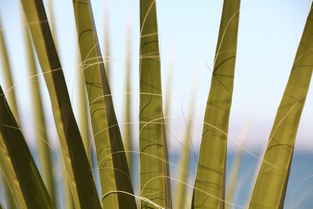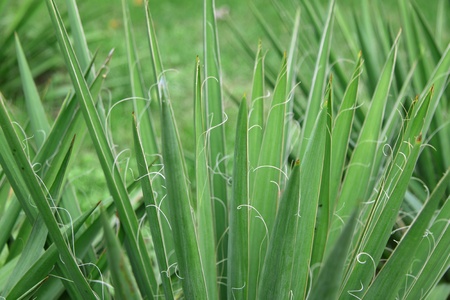 Mostly blurred long green leaves with prickles of sandpaper sotol