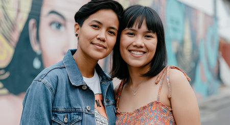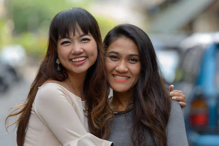 Young asian females smiling in urban street setting for cultural diversity and friendship